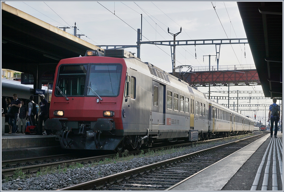 Scheinbar auf Test- oder Schulungsfahrt war dieser NPZ RBDe 562 Pendelzug in Noiraigue, der sich neben einem trn Flirt zeigt.