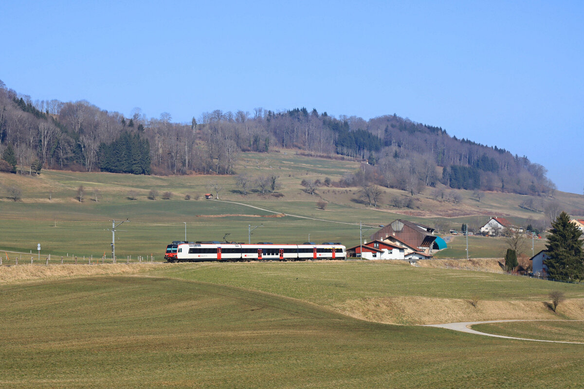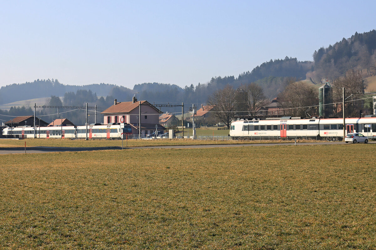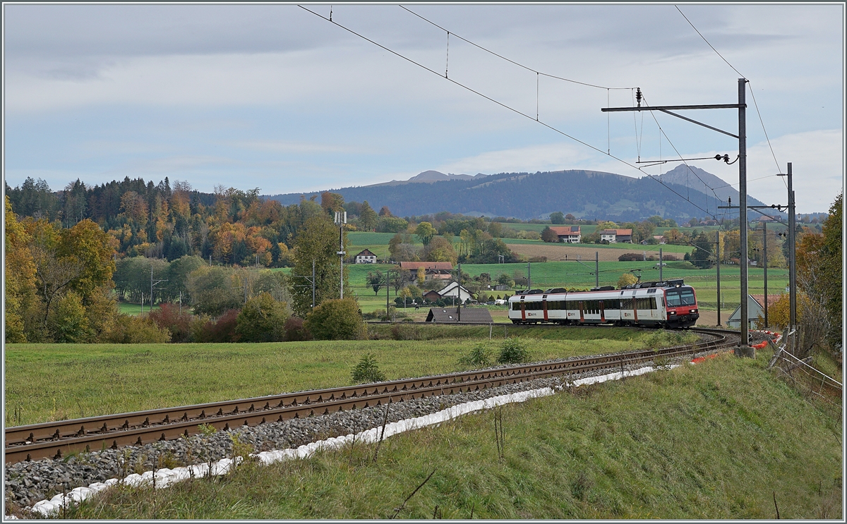 Die Station Henniez im Broyetal: Eben verlässt ein NPZ Domino-Zug - gestossen von 560 264 - als S9 des RER Vaud die Station Richtung Palézieux und Lausanne. 20.Mai 2021