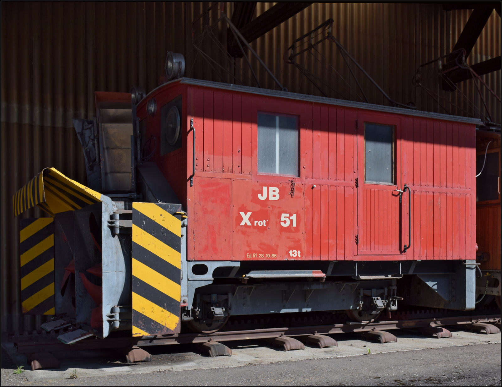 Jungfraubahn Lokomotive 9 wurde als Serie 8 bis 10 1912 für Zahnrad- und Adhäsionsbetrieb gebaut und 1951 zur reinen Zahnradlok umgebaut. Lange Zeit stand sie nach der Ausrangierung bei der Firma Steck in Bowil (Bild, 14.Juli 2017), zusammen mit der alten Schneeschleuder Xrot 51.