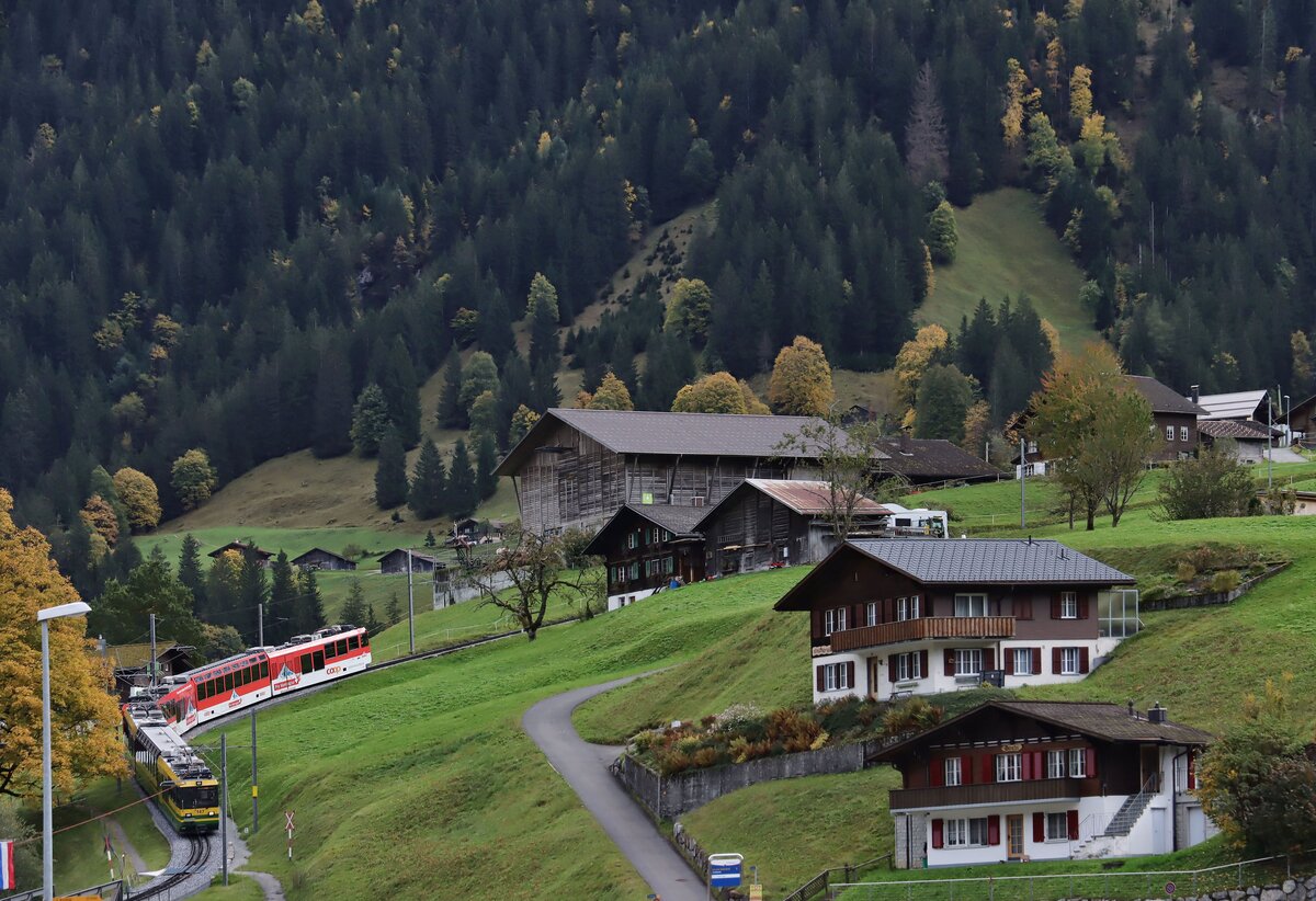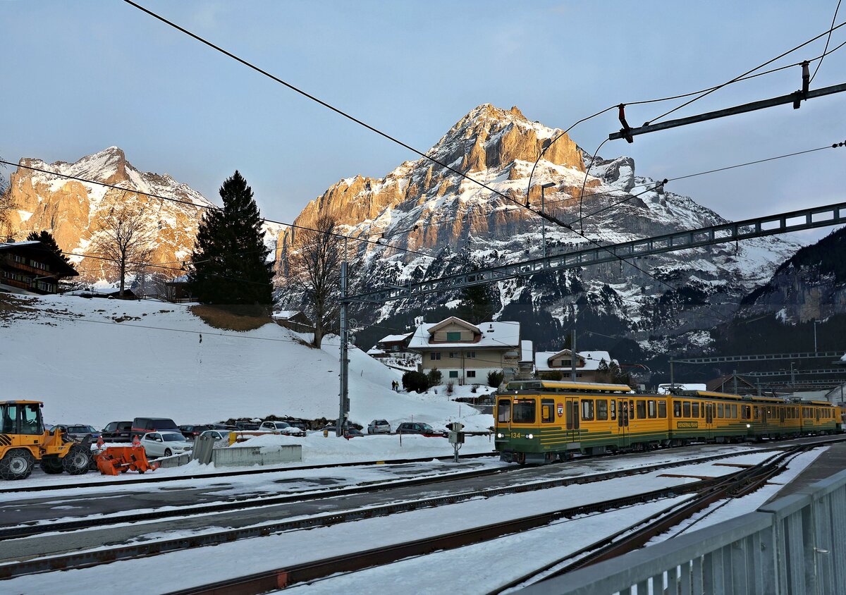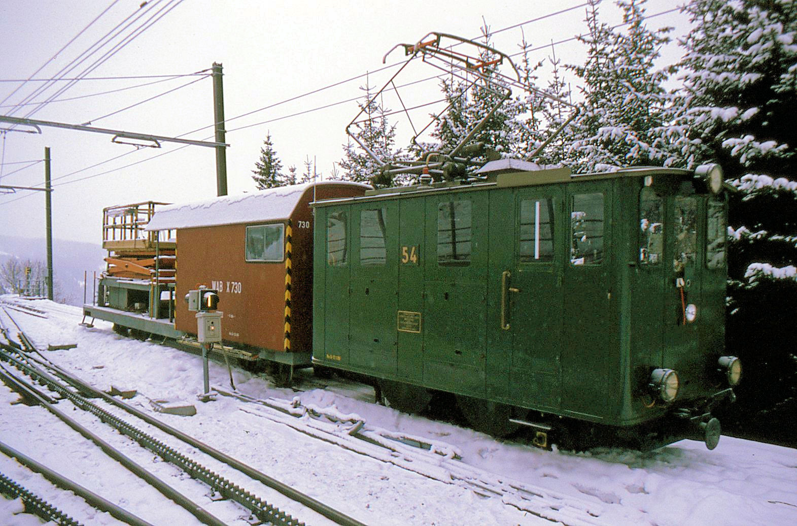Mit einem Dienstzug ist ein BDeh 4/4 der Wengernalpbahn im Juni 1990 unterhalb der mächtigen Felswände des Lauberhorns unterwegs