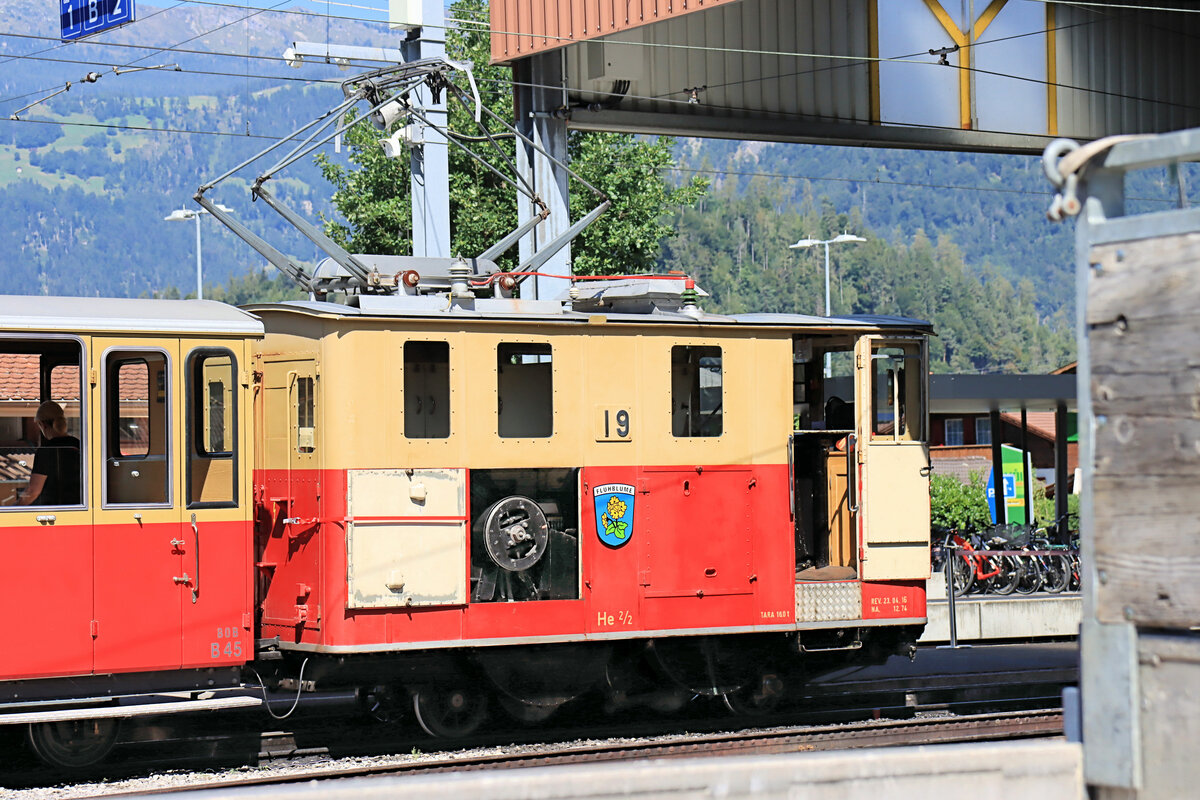 Da Stefan in seinem Bild der abgestellten Lok in Wilderswil auf das "Kamin" hinweist, hier noch einige Gedanken dazu. Als ich einmal in einer solchen Lok mitfahren konnte, die mit gesenktem Stromabnehmer und nur mit der Widerstandsbremse von der Schynigen Platte herunterkam, überraschte mich ein unangenehmer Hitzeschwall beim Erreichen des Talbodens. In Eile öffnete der Lokführer die Frontfenster und stellte sie "spitz". Offenbar entwickelt sich in diesen alten Lok während der Fahrt eine grössere Hitze. Im heissen Sommer 2022 fuhren alle Loks der Schynigen Platte Bahn mit geöffneten Seitenwänden. Hier Lok 19, die ehemalige Wengernalpbahn Lok 59. 23.August 2022 Peter Ackermann