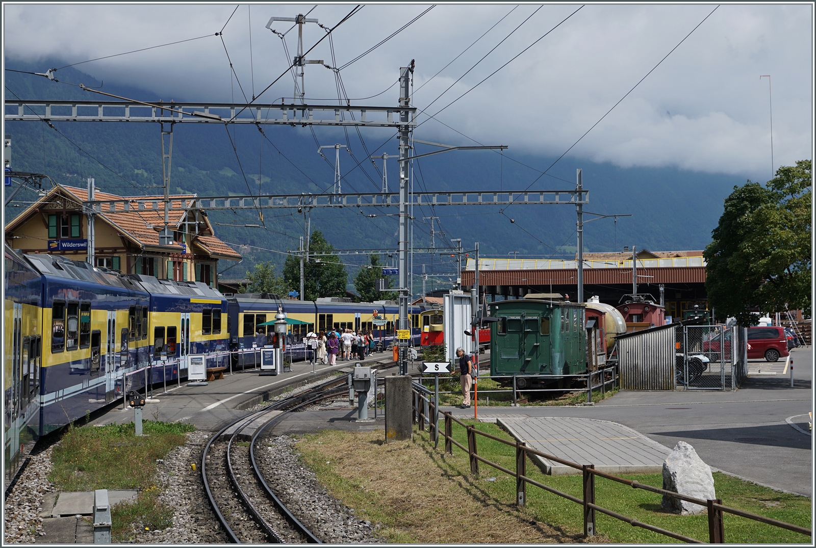 Blick auf den Bahnhof von Wilderswil bei der Einfahrt des R61/62 von Lauterbrunnen/Grindelwald - Interlaken Ost mit der Schynige Platte Strecke rechts im Bild und dem schmucken Empfangsgebäude links.