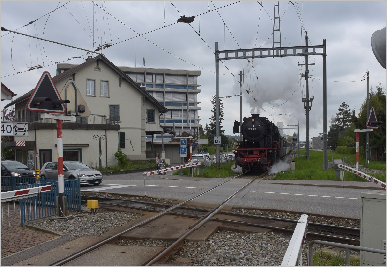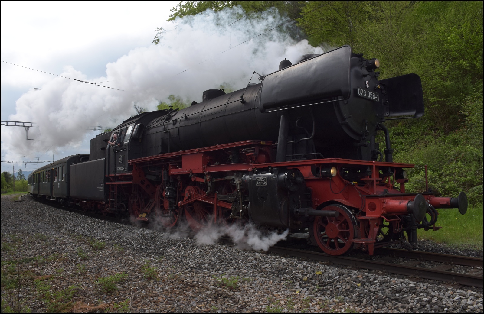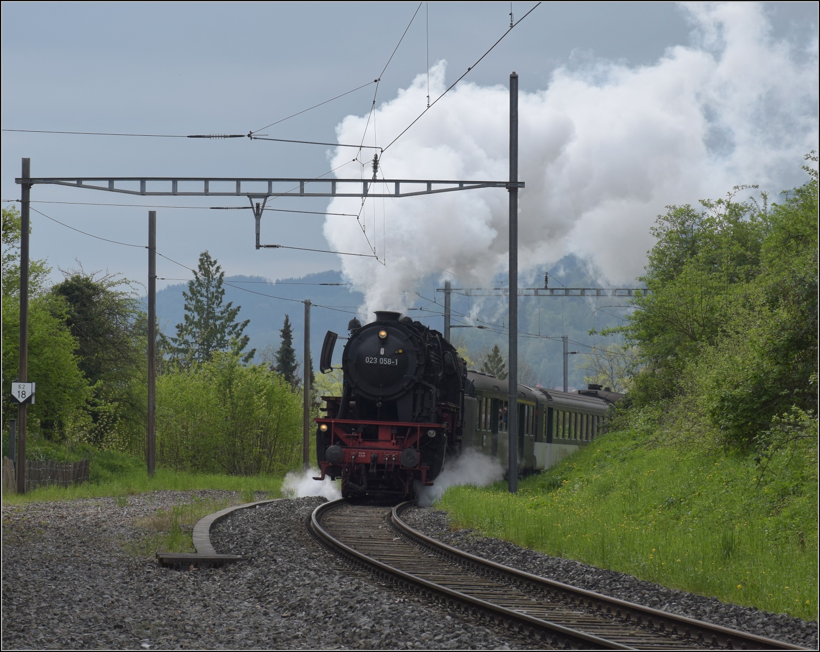 Überraschenderweise gab es keine Dampfentwicklung bei 23 058, dazu auch noch keine Alpensicht, sondern Hochnebel. Aber trotzdem einigermassen schön anzusehen. Egolzwil, April 2023.