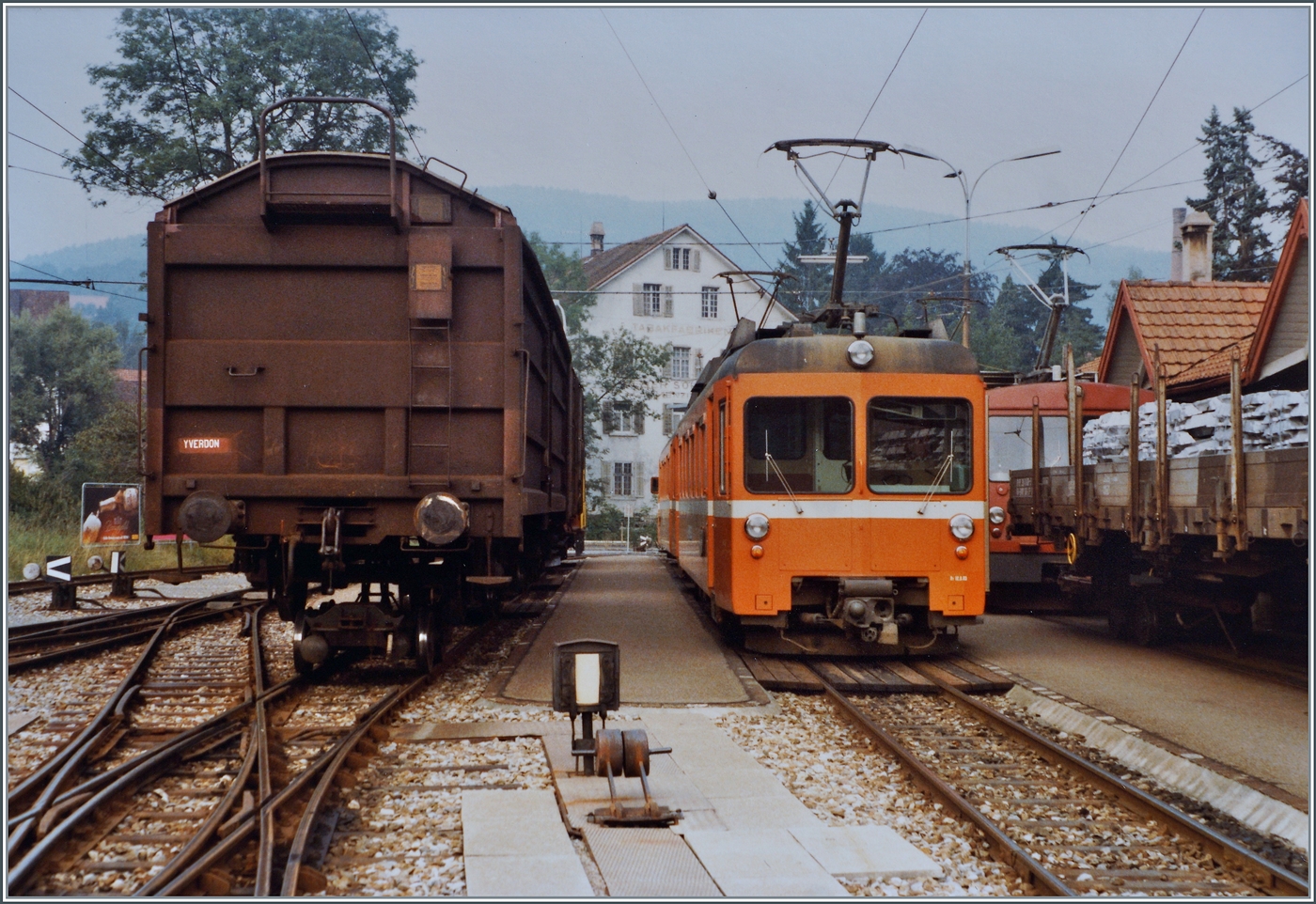 Der WSB De 4/4 steht mit einem aufgebockten Gklm und einem Gs als Güterzug 550 in Menziken Burg und wartet auf die Abfahrt nach Suhr.