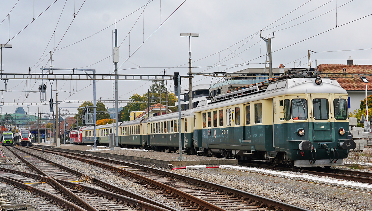 Triebwagentreffen Koblenz 2017. BDe 4/4 201 im Kleid der EBT ist eigentlich BDe 4/4 82 der SOB. Der Triebwagen wurde vom Verein Pendelzug Mirage mustergültig aufgearbeitet und ist hier im Bahnhof Koblenz zu sehen. August 2017.