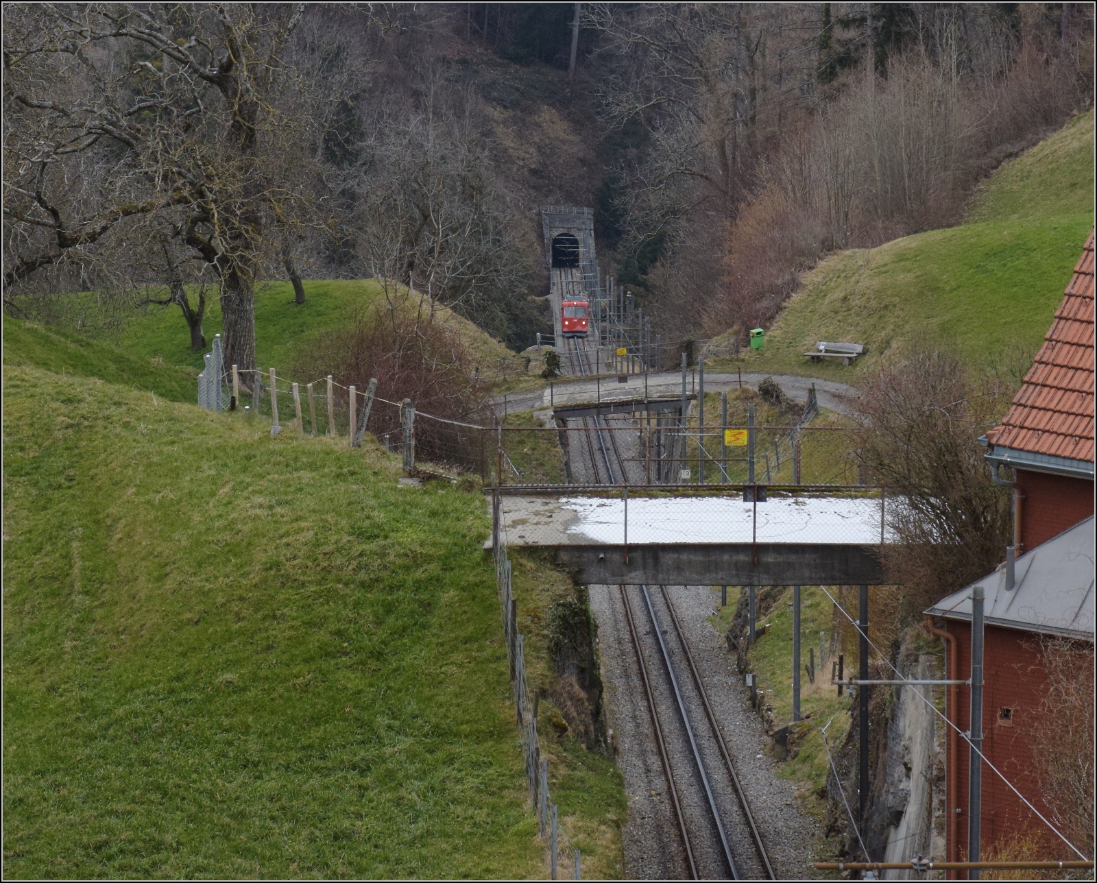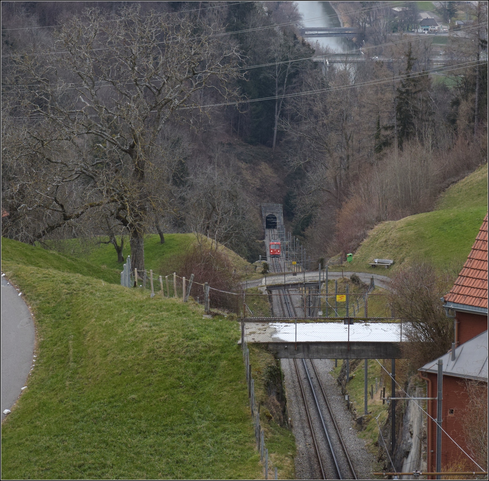 Der einzige Triebwagen BDe 1/2 der Rheineck-Walzenhausen Bahn unterhalb Walzenhausen, mit Blick Richtung Oesterreich und den Südostzipfel des Bodensees. 27.Februar 2023