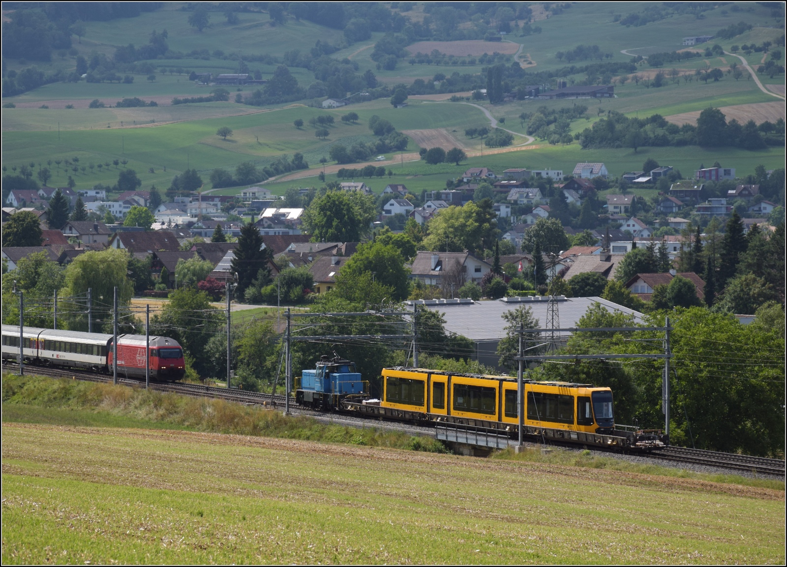 Die Stadler-Werkslok Eem 936 131 liefert eine neue TINA-Strassenbahn nach Darmstadt aus. Auf dem Weg in Frick begegnet der Transport der Re 460 094 'Rhätia' mit einem umgeleiteten IC. Juli 2023. Olli