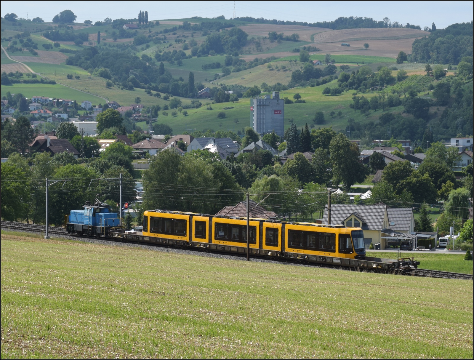 Die Stadler-Werkslok Eem 936 131 liefert eine neue TINA-Strassenbahn nach Darmstadt aus. Auf dem Weg in Frick, Juli 2023.