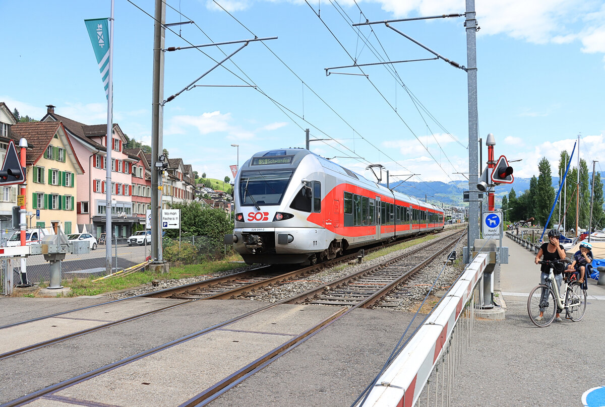 Einfahrt des SOB 526 044 als S6 Rapperswil - Uznach - Schwanden (Glarus) in Schmerikon, vor den malerischen Häusern dieses typischen See-Städtchens. 9.Juli 2021