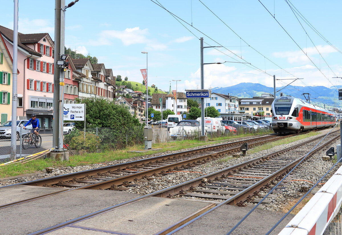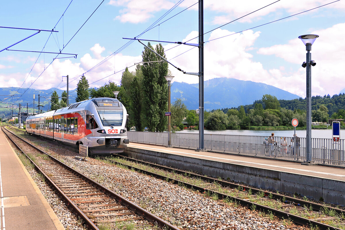 Schmerikon, am allerobersten Zipfel des Zürichsees: Hier regiert die Südostbahn mit ihrer Fernverkehrslinie Luzern-Arth Goldau-Rapperswil-St.Gallen (Voralpen Express) und ihrer Regionallinie St.Galler S-Bahn Linie 6 Rapperswil - Uznach - Schwanden GL. SOB Flirt 526 060, 9.Juli 2021 Peter Ackermann