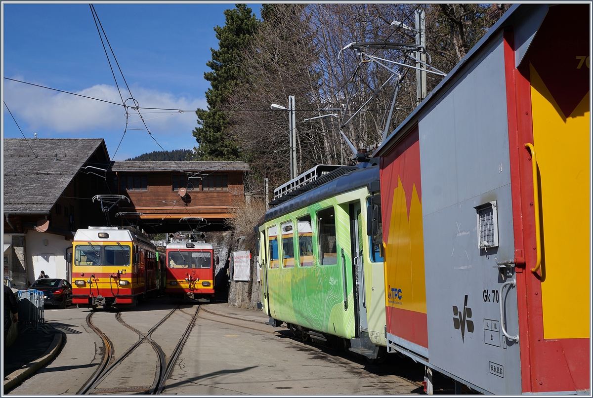 Ab Bevieux bis zum Bahnhof in Bex fährt die BVB erneut auf der Strasse, wobei es besonders im Ortskern von Bex ziemlich eng zugeht. Im Bild der BDeh 4/4 81 mit seinem Bt kurz vor der Haltestelle Bex Pont Neuf unterwegs.