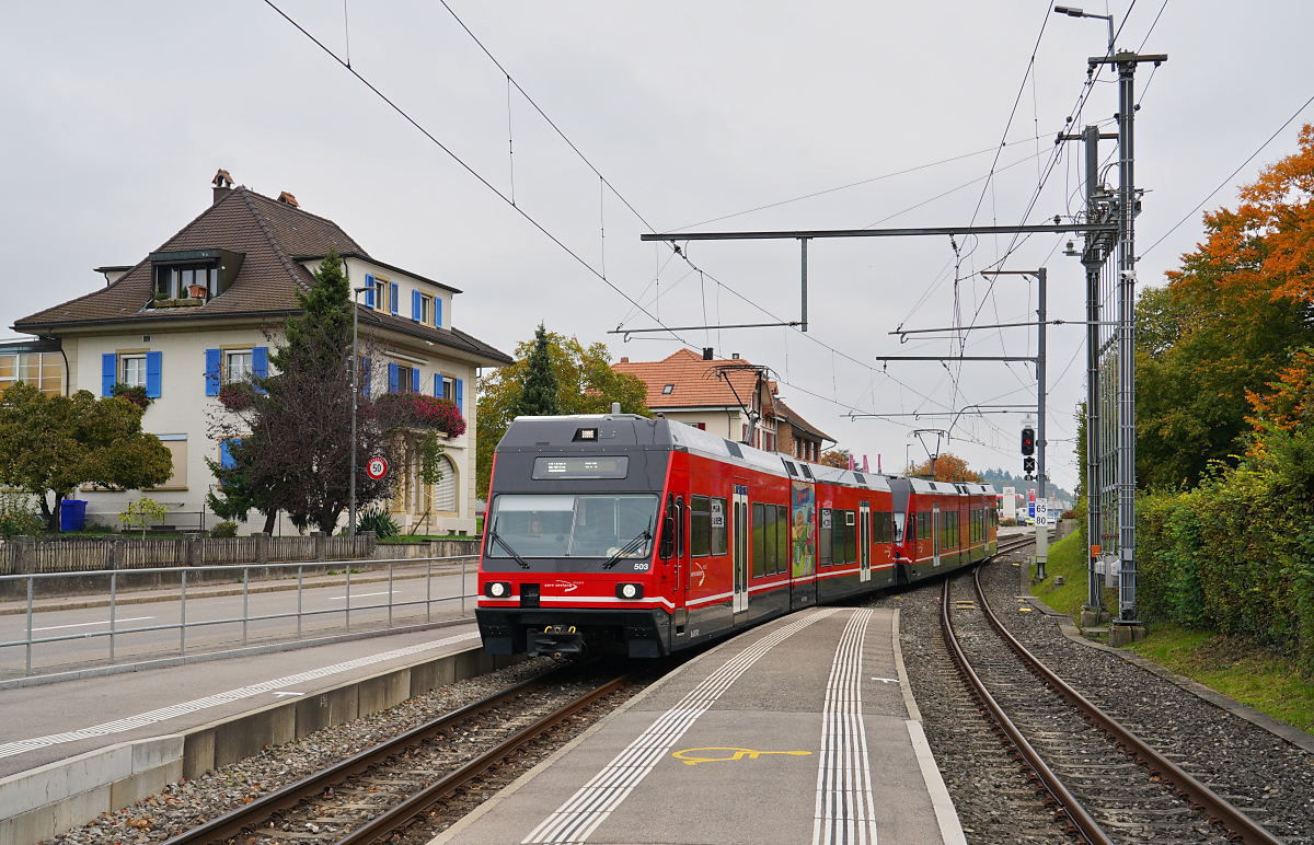 Kurz nach Verlassen des Bahnhofs Ins Dorf fahren die Be 2/6 510 und 503 am 11.10.2025 am ehemaligen BTI-Triebwagen BDe 4/4 5, später BRe 4/4 516 und heute Restaurant "Ankerstube", vorbei