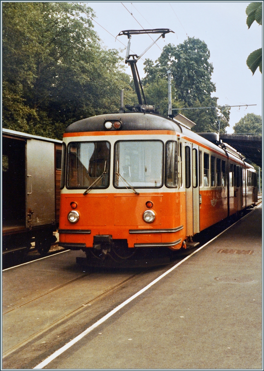 Der WM BDe 4/4 N° 2 wartet mit einem DB Gs und einem SBB Gms als Regionalzug 4928 am 25. Juli 1984 auf die Abfahrt nach Fahrwangen Meisterschwanden. Die 8.23 lange Wohlen - Meisterschwanden Bahn wurde am 17. Dez. 1916 eröffnet und mit 1000 -1200 Volt Gleichstrom betrieben. Eine Umstellung auf Wechselstrom am 18. März 1966 brachte der nicht gerade florierenden Bahn auch nicht den erhofften Aufschwung, so dass sie schliesslich am 31. März 1997 eingestellt wurde.