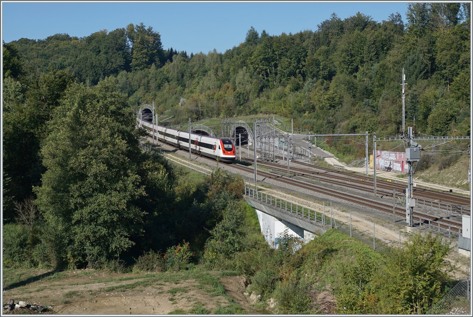 Ein ICN RABe 502 von Solothurn kommnend erreicht in Wanzwil (Dienst- und Abzweigstation) die NBS Mattstetten - Rothrist.