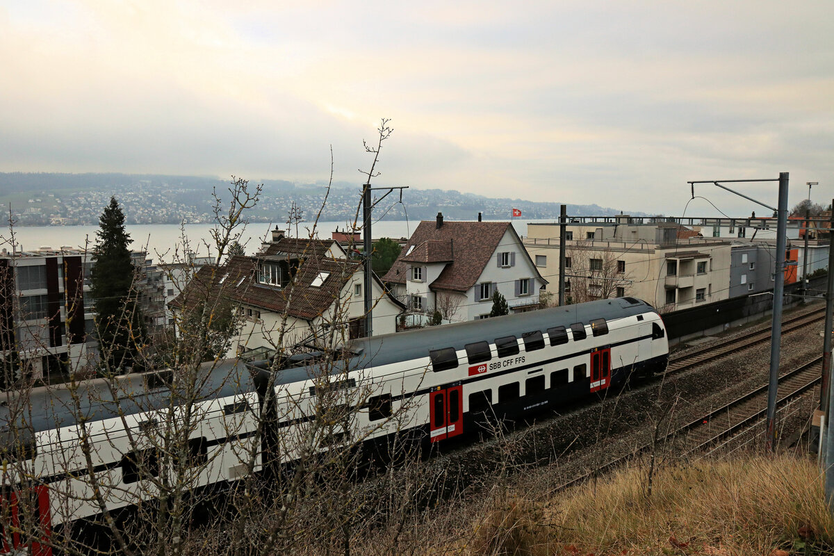 Eine S8 nach Päffikon SZ fährt in Thalwil von der Seestrecke mit Halt an allen Stationen her ein. Triebzug 514 026. 6.Februar 2023