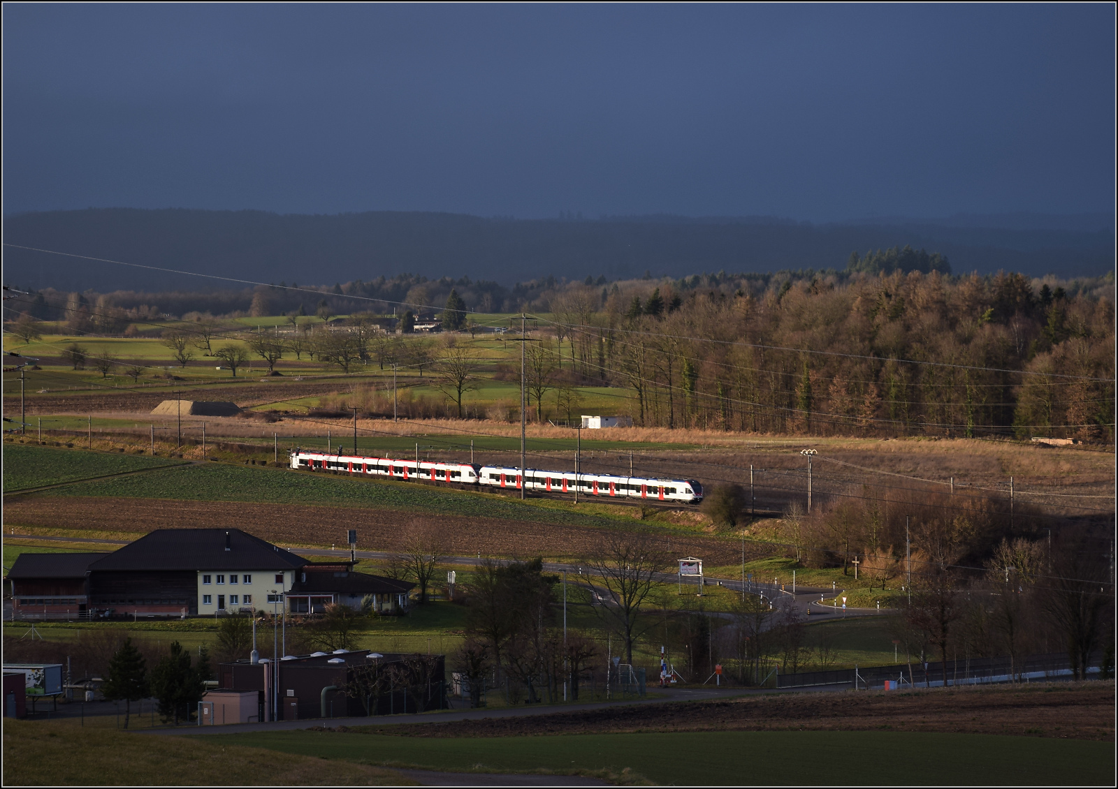 Eine Doppeltraktion Flirt RABe 523 bekommt einen Spotlight von Petrus. Februar 2026.