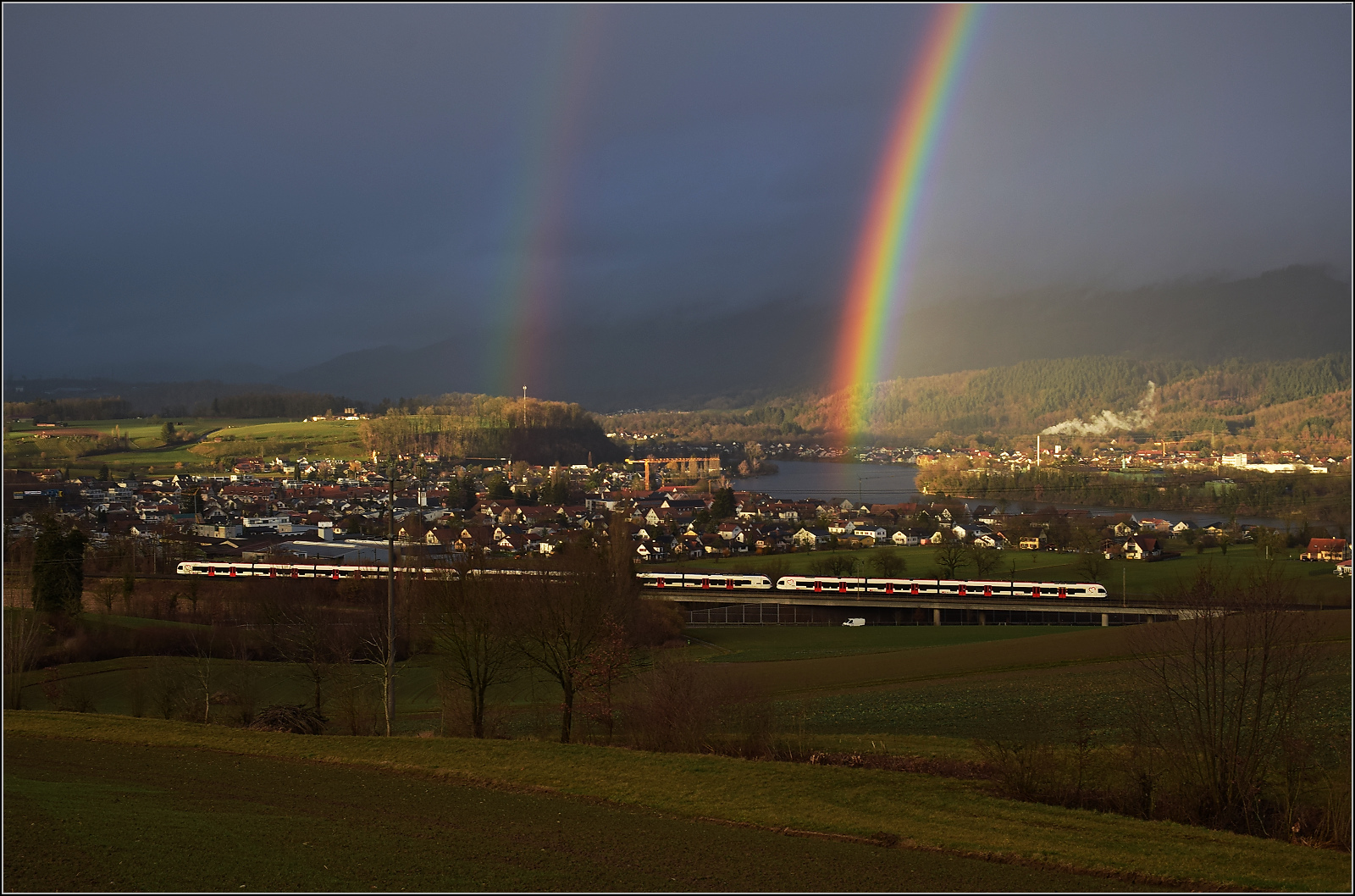 Eine Doppeltraktion Flirt RABe 523 unter einem Hochrhein-Regenbogen. Februar 2026.