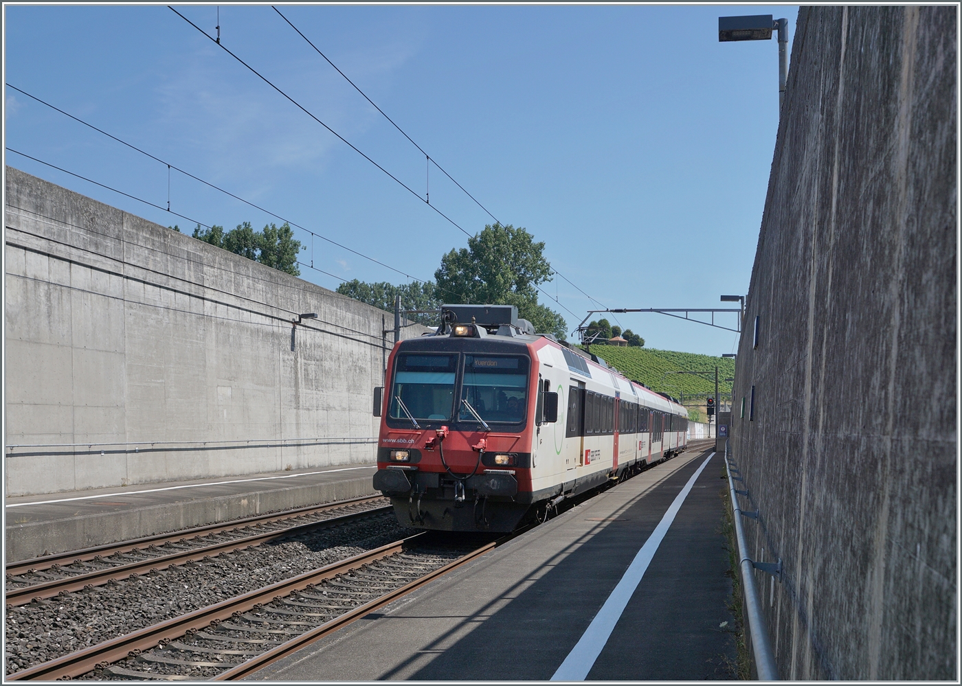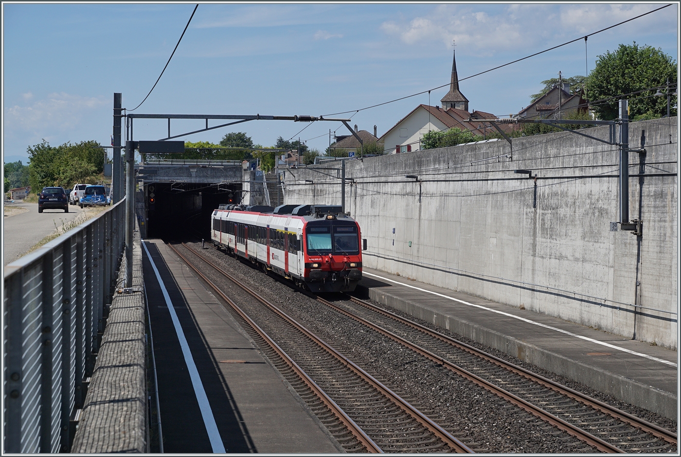 Auch der Ort selbst, den man von Bahnstrecken nicht mehr sieht, lohnt auf jeden Fall ienen Besuch. Im Bild ein ausfahrender SBB Domino als R13 von Yverdon nach Biel/Bienne. 5. Juli 2025
