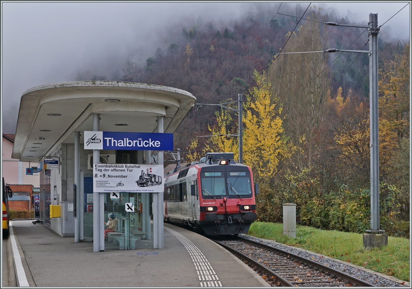 Thalbrücke mit der einfahrenden OeBB S22 26041 von Oensingen nach Balsthal. Links im Bild wirbt der Eisenbahnklub Balsthal für den Tag der offenen Tür. Im Ramen dieser Veranstaltung bot der Verein "Team Ee 3/3 II 16515" am Samstag mit der schmucken SNCF C 90155 UIC N° 97 85 1 932-0 (ex SBB Ee 3/3 II 1615, ex SNCF C 90155) Führerstandfahren Balsthal - Klus - Balsthal) an. 8. Nov. 2025