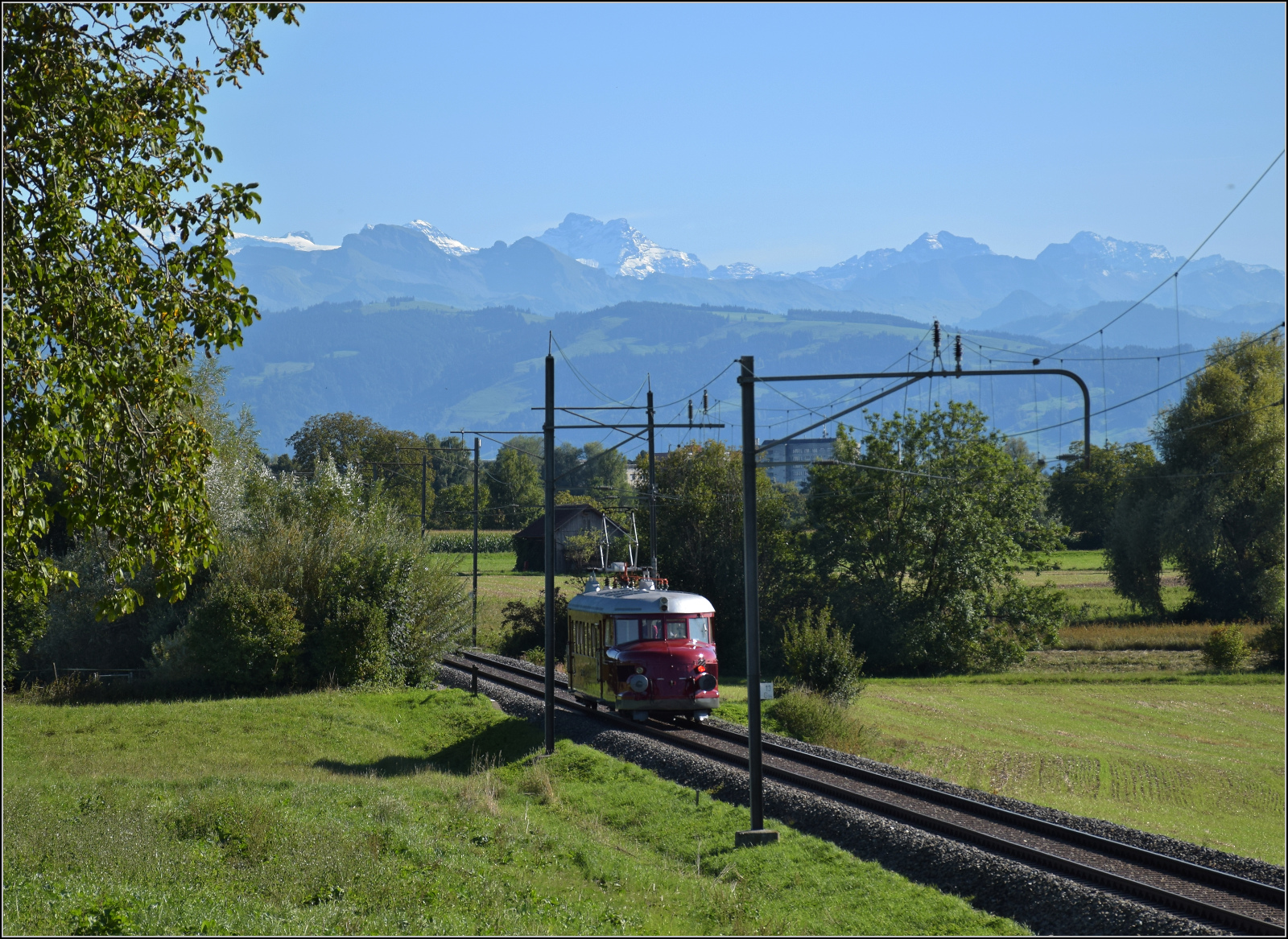 Der Rote Pfeil aus Balsthal durfte beim Jubiläum mitfeiern. Der Aussendienst auf der Kempttalbahn zur Vervollständigung einer Rundfahrt über die Tösstalbahn und Uerikon-Bauma-Bahn zeigt RCe 2/4 607 bei Auslikon nahe dem Päffikersee. Im Hintergrund ist noch hinter dem Baum der Clariden (3267 m), dann sind der Chammliberg (3215 m), in Bildmitte Gross Schärhorn (3292 m)und Chli Schärhorn (3232 m), dann Höch Windgällen (2764 m) und rechts der Gross Ruchen (3137 m) prominent im Bild. September 2025.